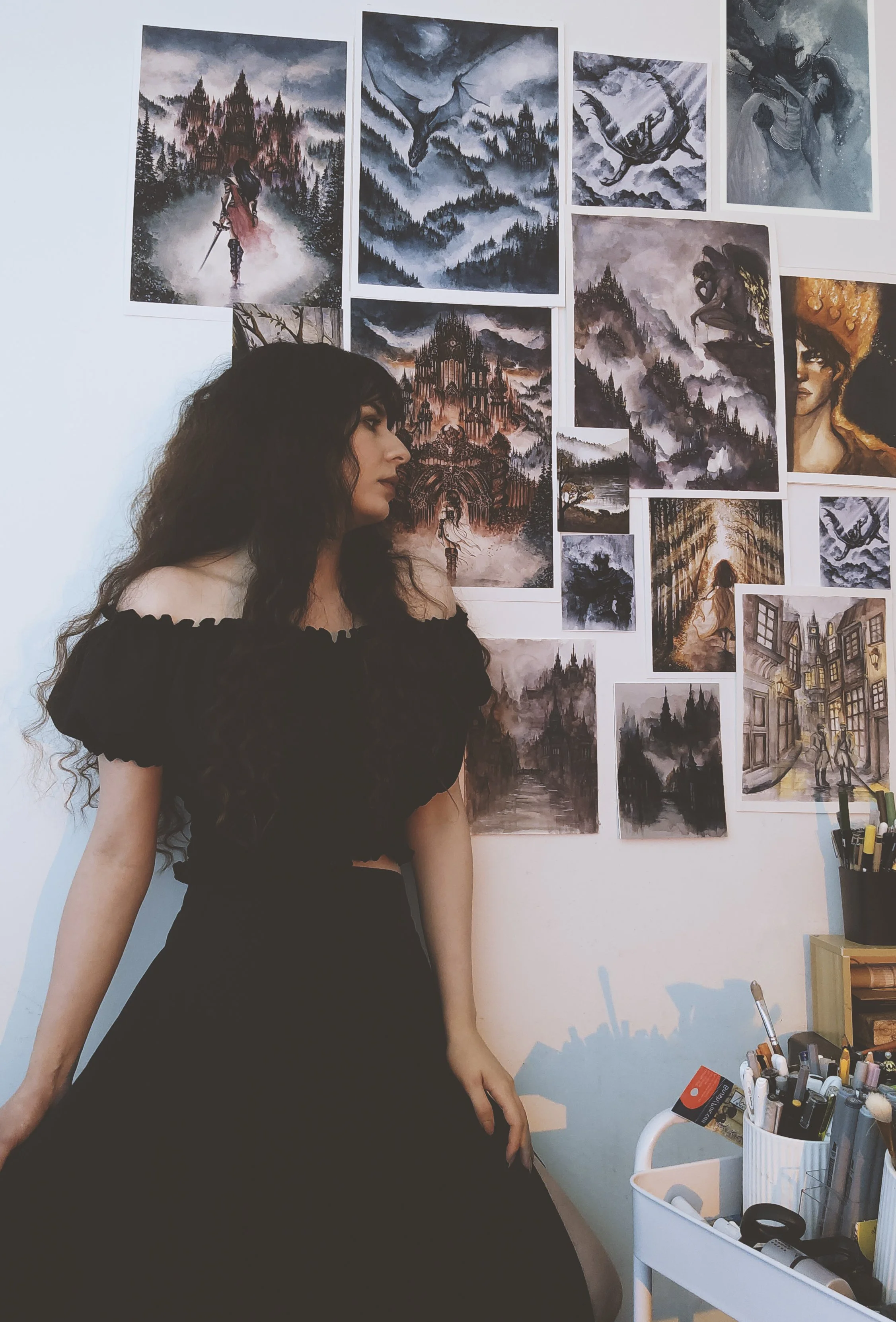 Recurring motifs include castles, forgotten landscapes, solitary figures, and intricate maps. Her imagery draws on the emotional weight of fantasy storytelling and explores the tension between hope and darkness, power and fragility, and destiny and loss.